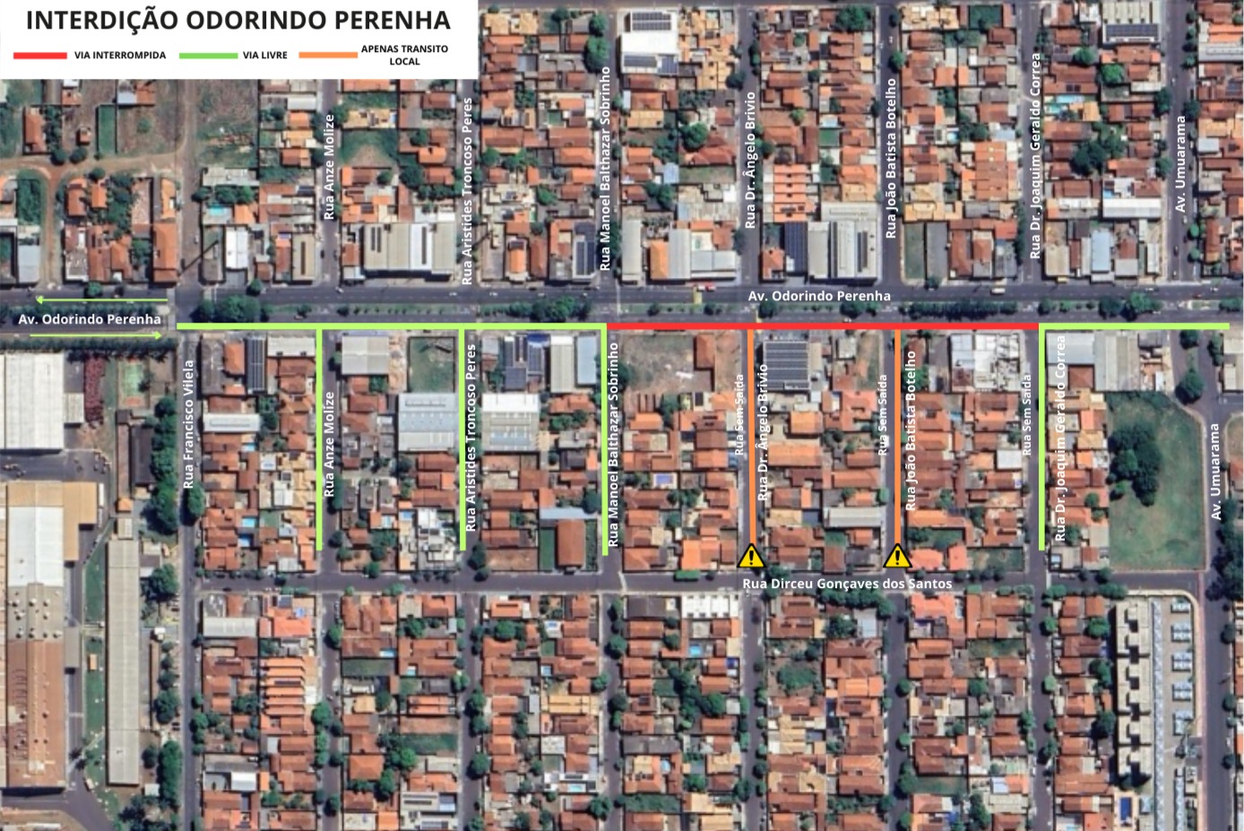 Com o avanço das obras, o trânsito fica liberado na Av. Odorindo Perenha para os motoristas que trafegam em direção à Zona Leste, desde a rotatória da Av. Waldir Felizola de Moraes até a rua Manoel Balthazar Sobrinho. Dali em diante, os motoristas podem tomar à esquerda, pela própria rua Manoel Balthazar Sobrinho e seguir pela Rua Dirceu Gonçalves dos Santos até a Rua Joaquim Geraldo Correa, onde podem retornar à Av. Odorindo Perenha.